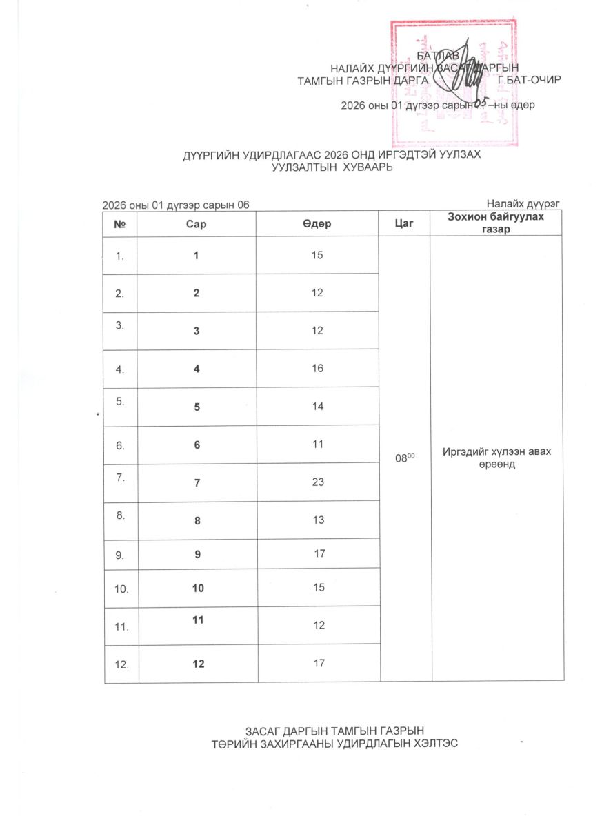 ЗАСАГ ДАРГЫН ИРГЭДТЭЙ ХИЙХ УУЛЗАЛТЫН ХУВААРЬ /2026 ОН/